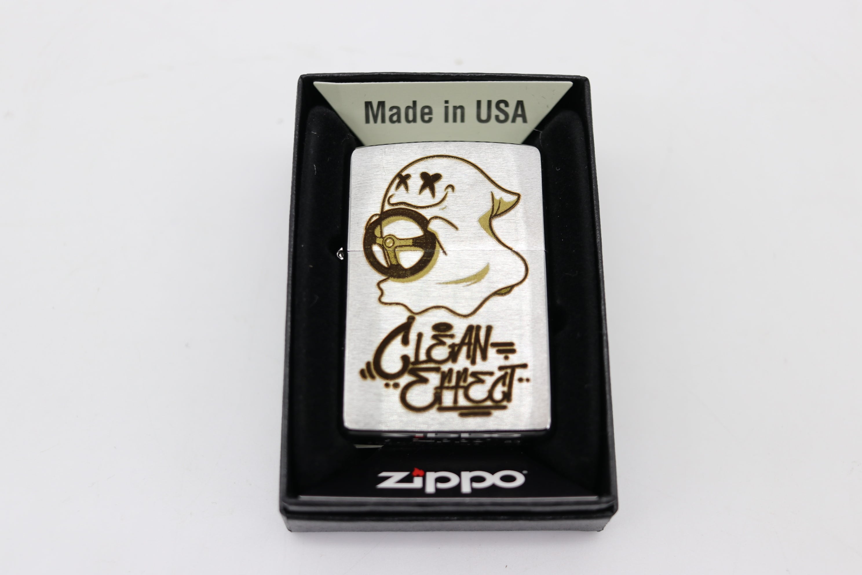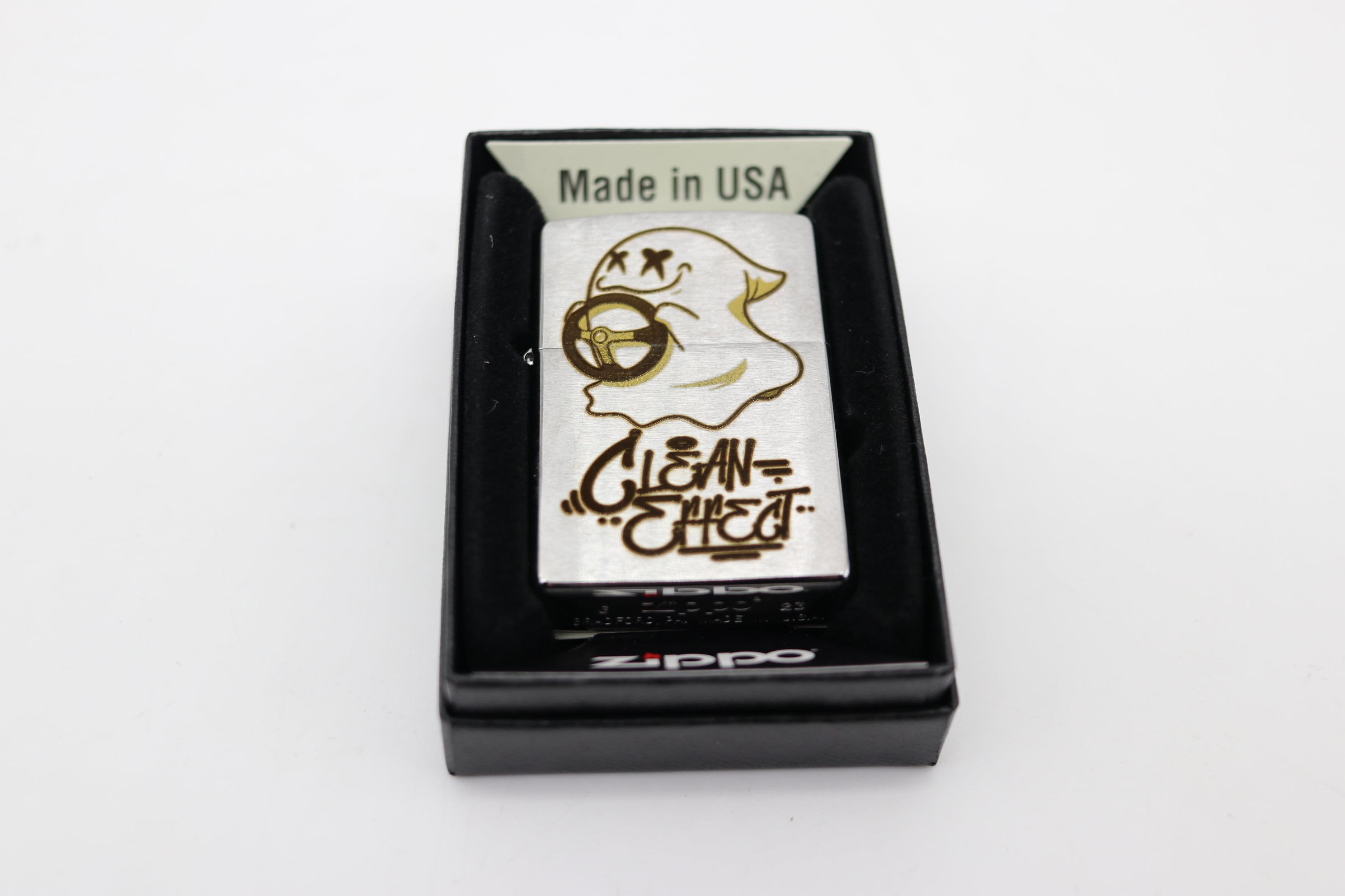 "GhostExpod"のレーザー彫刻が施されたZIPPOです。