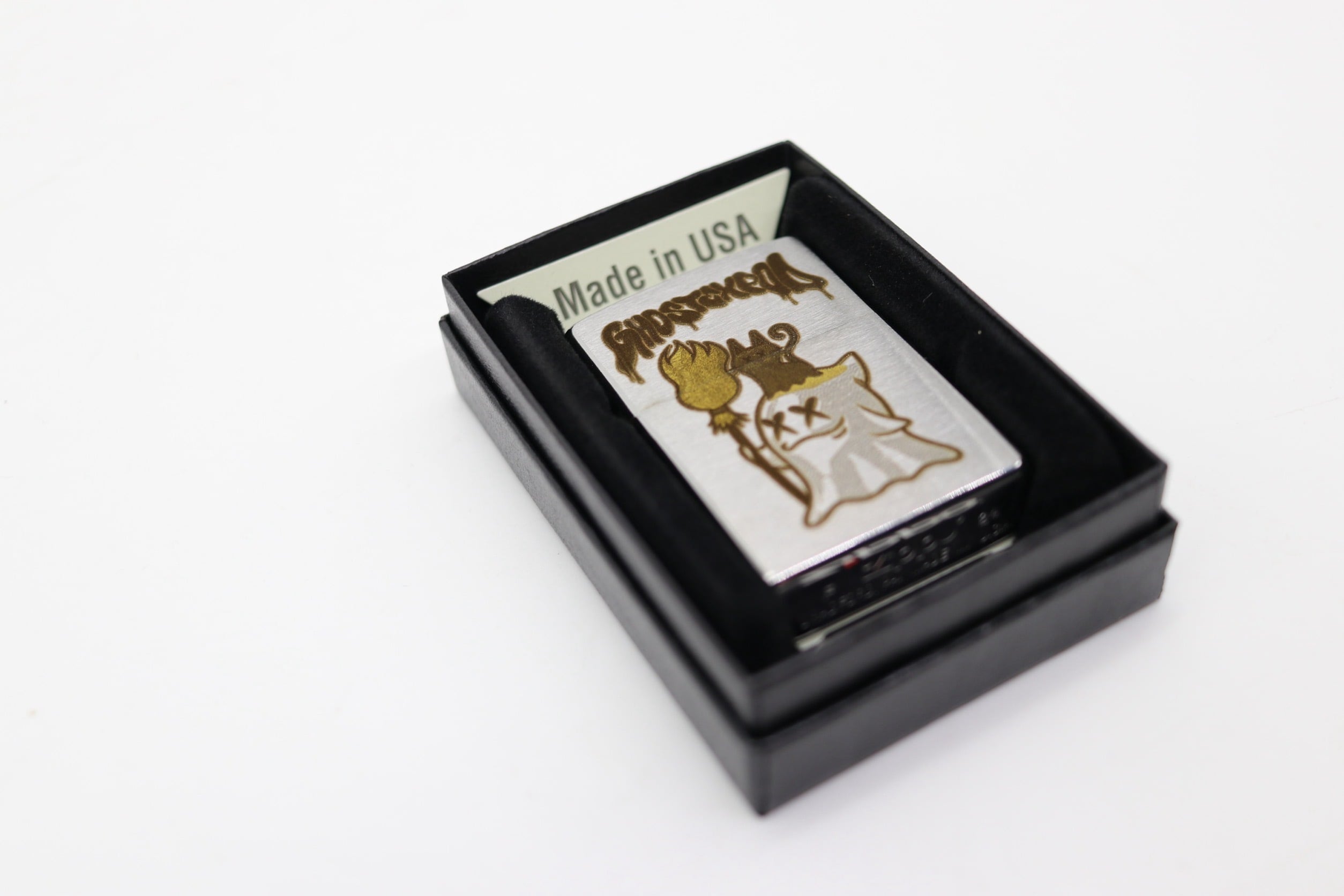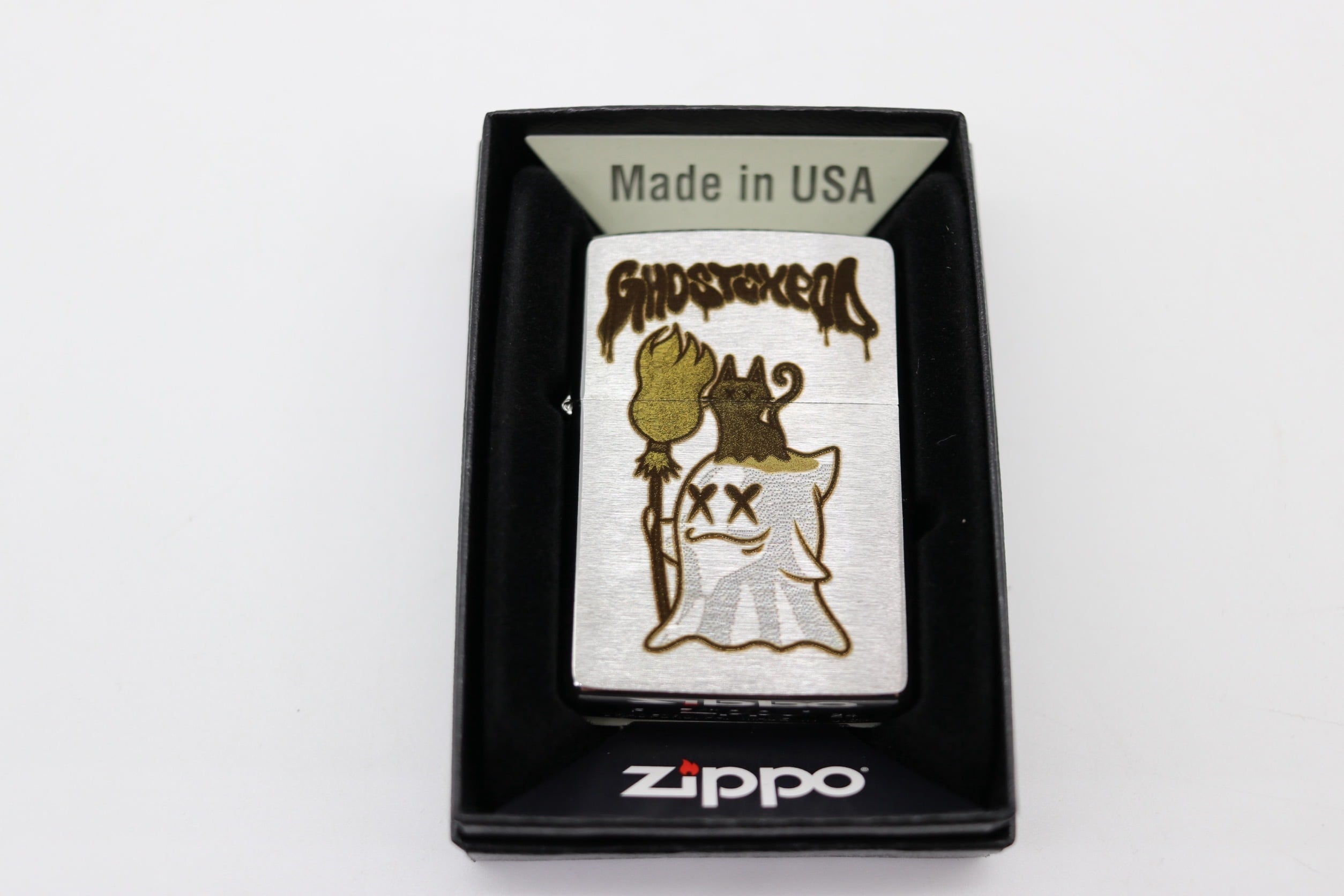 "GhostExpod"のレーザー彫刻が施されたZIPPOです。