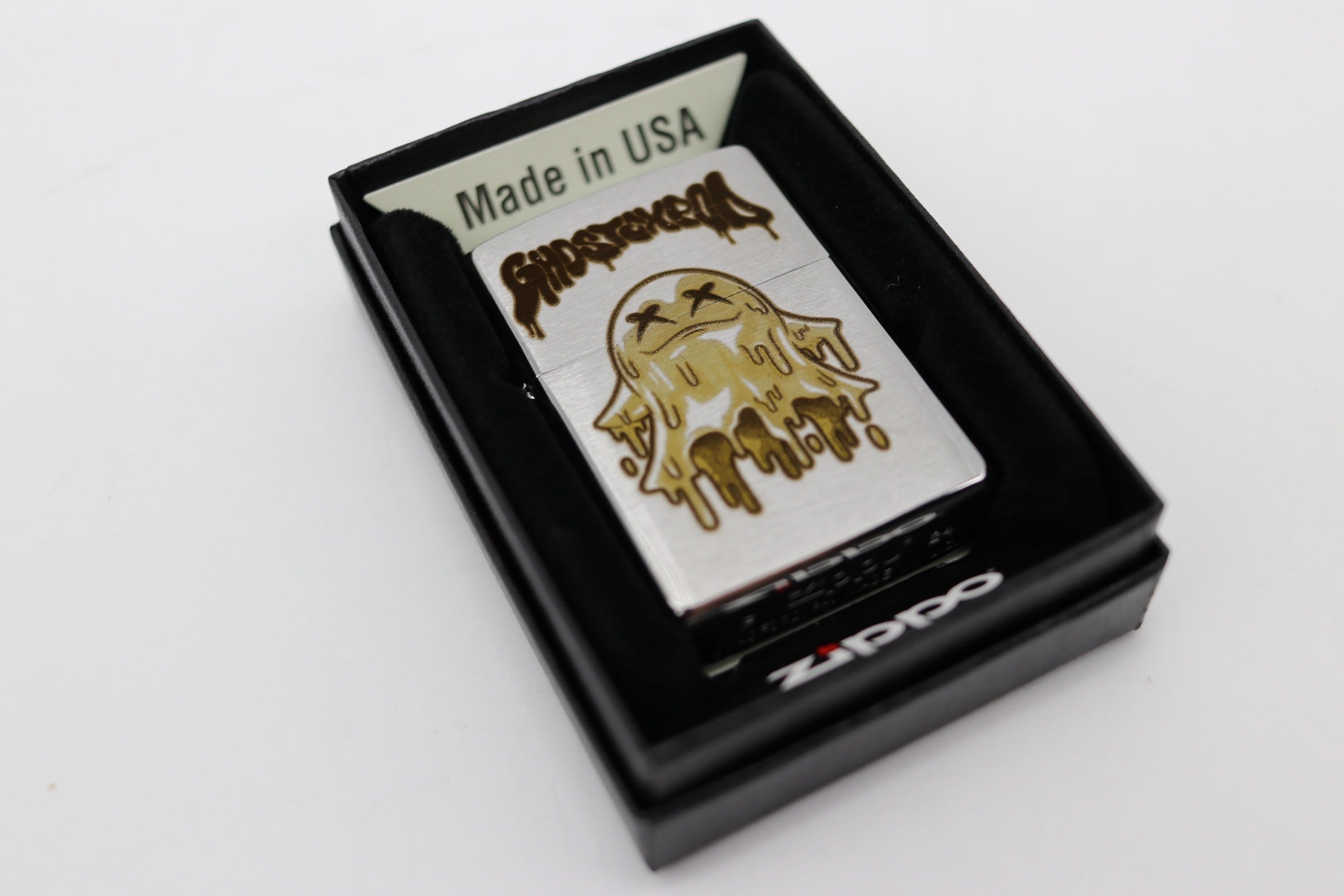 "GhostExpod"のレーザー彫刻が施されたZIPPOです。